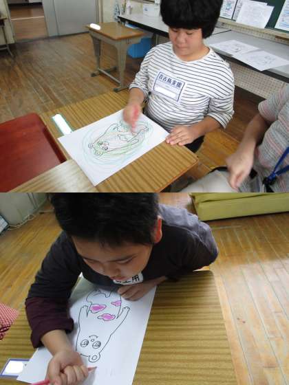 出来上がった児童は,昨日校外学習でみた「あべのべあ」に色を塗りました。