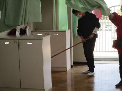 それからモップで床を拭きます。何もない教室は思ったより広く感じます。先生と一緒に床ふきをしました。
