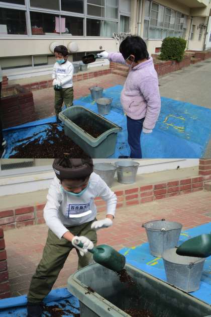 でも、二刀流で2つのスコップでプランターに土を入れていました。