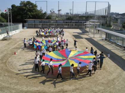 水曜日の朝は、バルーンの時間です。グランドに中学部の生徒は集合。そこで、楽しい音楽に合わせて行います。1つのグループには、1年生も2年生も3年生もいます。バルーンの端をもって、手を上にあげて歩いたり、バルーンをみんなで上下に揺らしたりします。みんなで力を合わせて上手にふくらませたり、下にしたりしています。中3の生徒は、2週間ぶりでしたが、楽しそうに行っていました。