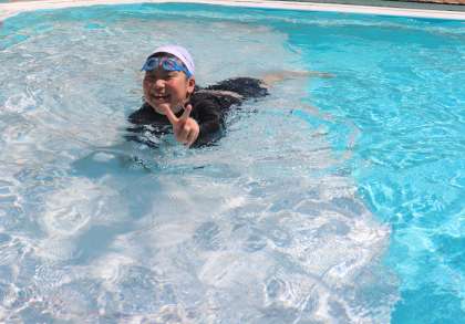 とってもいいお天気の中最後の大プールがありました。
