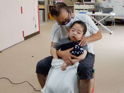今日はパワープレートに2パターンの乗り方をしました。足を乗せるパターンと、お尻を乗せるパターンです。お尻を乗せると全身がぶるぶると振動し、思わず「あ〜!」っと声が出るT君でした!