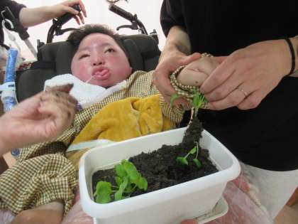先日植えた大根が大きくなってきてプランターだと狭くなってしまったので、ペットボトルでつくったプランターに植え替えました。スコップを使って土を入れたり、苗を引っこ抜いてペットボトルに植え替えたりと大変でしたが、しっかり手に力を入れて植え替えることができました!大きくなるのが楽しみですね!