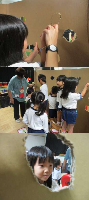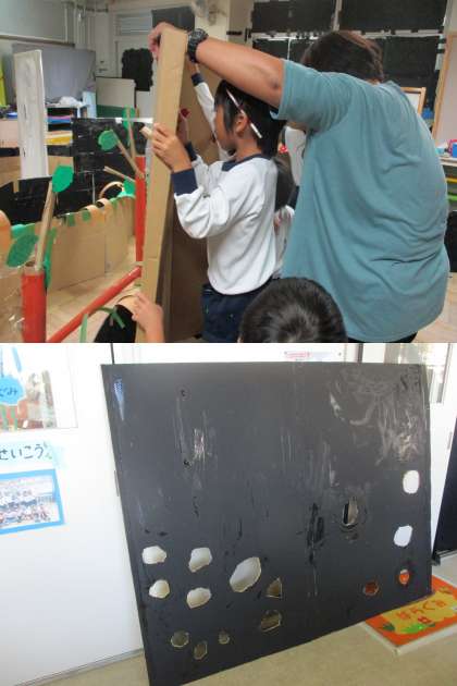 つくってあそぼうのおばけやしきコーナーでは,突如,不思議な壁が現れました。ダンボールカッターで懸命に穴をあける子どもたち。