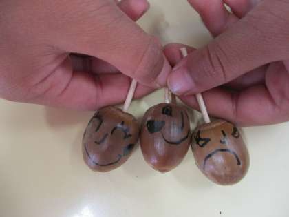 先日,土居川公園でひろってきたどんぐりに棒をさして顔を描いて,どんぐりごまを作って回して遊びました。