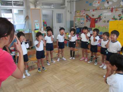 「あっか〜んべ〜し〜よう〜♪」であっかんべ〜をやってみるといいねと,みんなで歌いながらあっかんべをしています。
