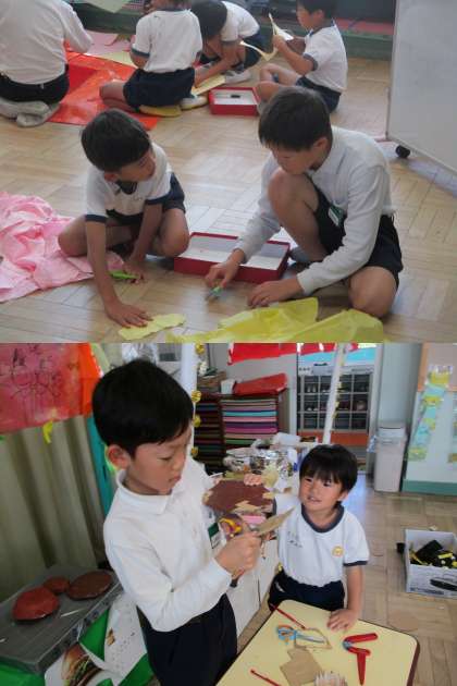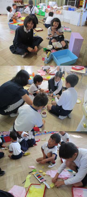 4年生の精密な作業はすみれぐみの子どもたちを圧倒します。さすがは4年生!こんなモデルを身近に感じられることは貴重な機会ですね!