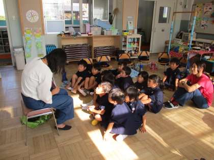 今日の絵本は『おおきな おおきな おいも』でした。ばら組の時に大好きだった絵本を,また読んでいただきました。この季節にぴったりですね。