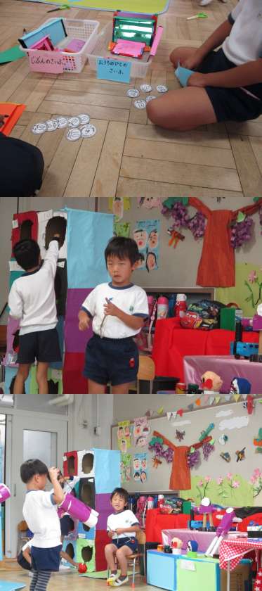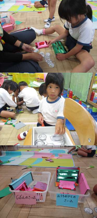 お弁当を食べた後は,わくわくつくったらんどで使う財布を作りました。自分とおうちの人の分を作りました。ちゃんと,自分とおうちの人の名前を書いている人もいますよ。どちらの財布にも10枚ずつコインが入っているか,先生と一緒に確認しました。