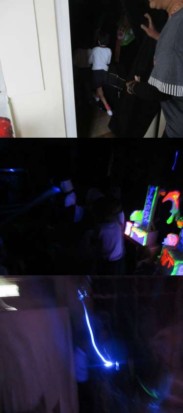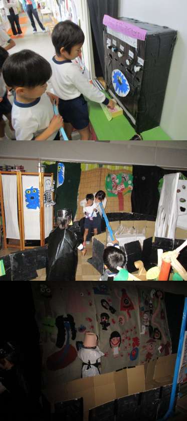 おばけやしきでは,2人1組で進んでいきました。1人で入れる勇気のある人もいましたよ。チケットを買って出発です。いろいろと工夫のあるおばけたちが,出迎えてくれましたね。