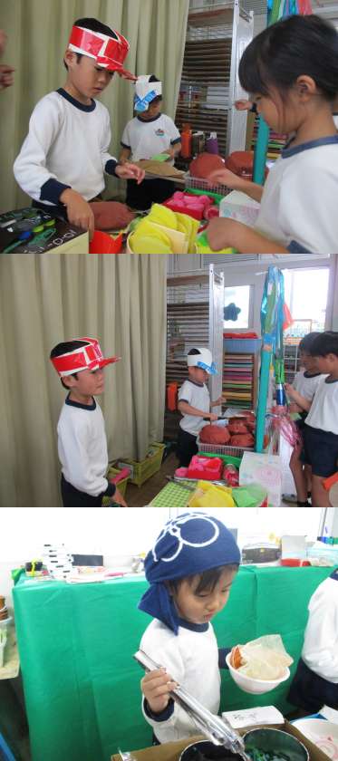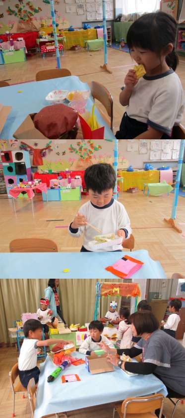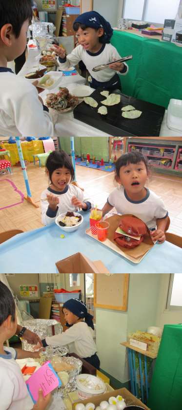 おいしそうな料理ができています。店員さんとお客さんのやりとりも,本物に近づいてきましたね。お弁当前のこの時間帯,本当にいいにおいがしてきそうで,おなかがグーグーなりそうです。