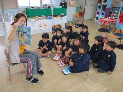 わくわくだんの活躍に引き込まれいく子どもたち。絵本が始まる前まではわいわいがやがやしていた子どもたちも,しっとりとした時間を過ごしています。