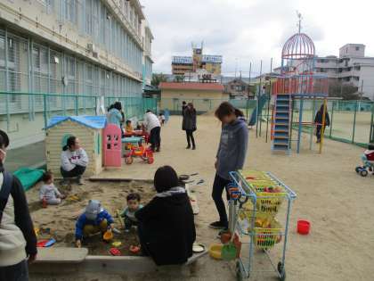 ぽかぽか陽気の園庭でみんな楽しく遊んでいます。