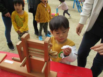 その中で,幼稚園で採れた綿の種を取る道具を持ってきてくださった方がいました。こんな珍しい道具を使えることは,貴重な経験ですね。