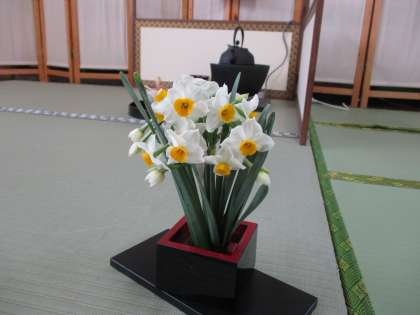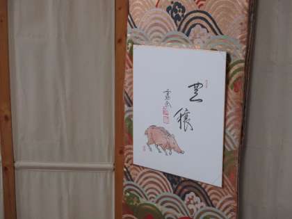 今日は,季節に合わせて,いのししのお軸と水仙のお花をご用意していただきました。いのししのお軸にあるように,「豊穣」となる3学期にしたいですね。