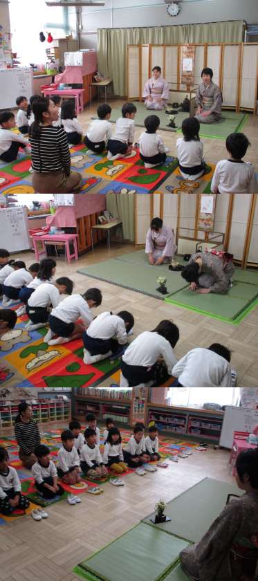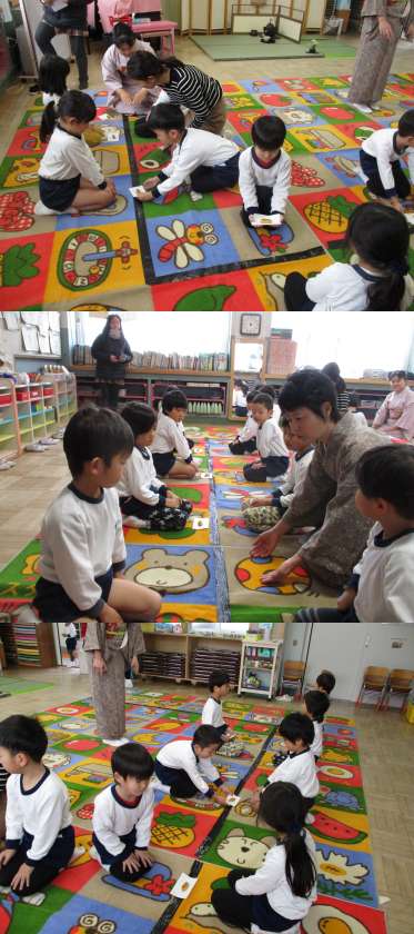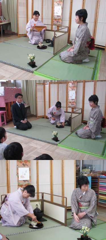 先生とごあいさつをして,説明を聞きながら見本を見せていただきました。その後,自分たちでお菓子のお運びをしました。
