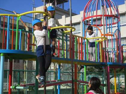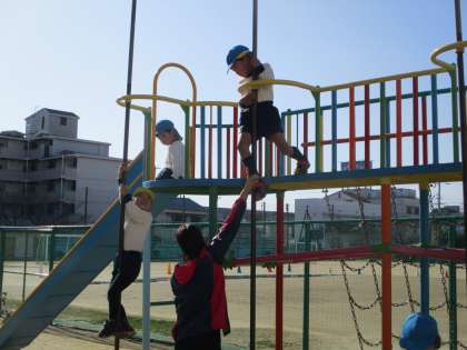 登り棒で降りるのがうまくなっています。今日で全員できました。