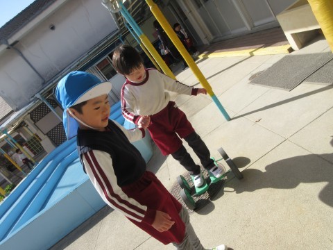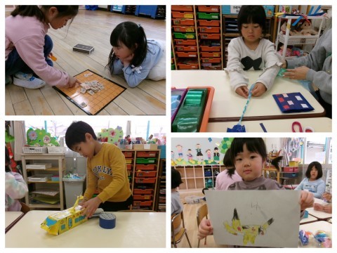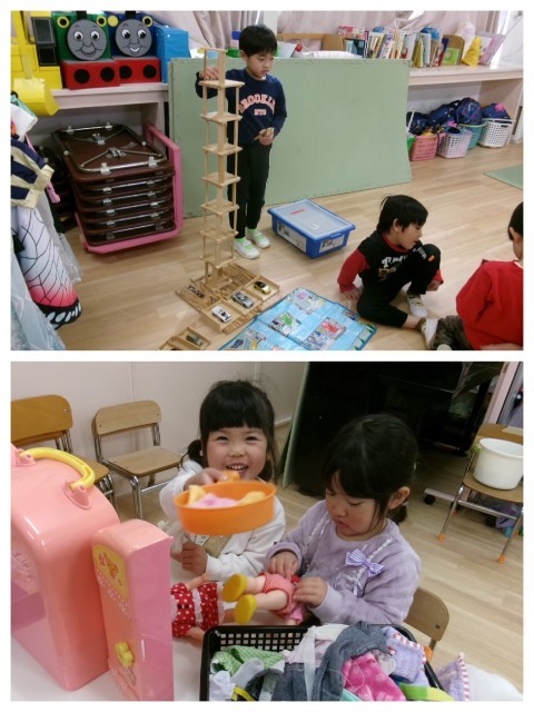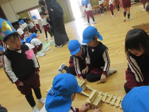 「ちいさい組さんに見せてあげよう」「教えてあげる!」と張り切ったり,難しそうな遊びは「こうしたら遊べるかも」と遊び方を変更したりする5歳児の姿。5歳児に手伝ってもらって初めてできたことを喜ぶ3・4歳児の姿。隣同士,会話も直接的なかかわりはなくても,じっくりと同じ場を楽しむ姿もありました。