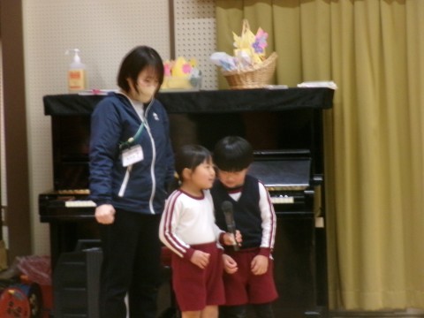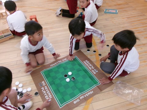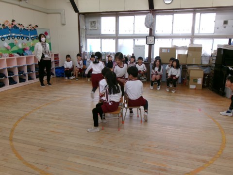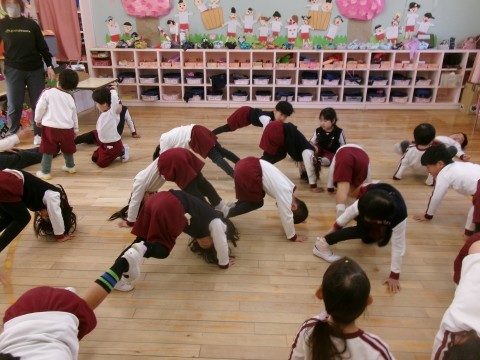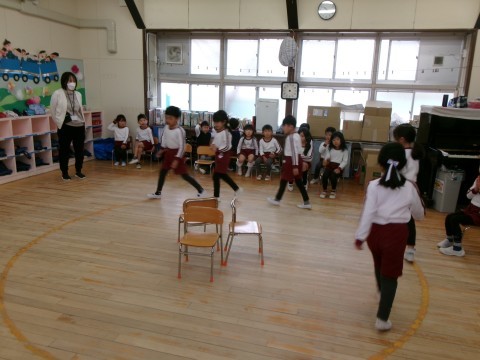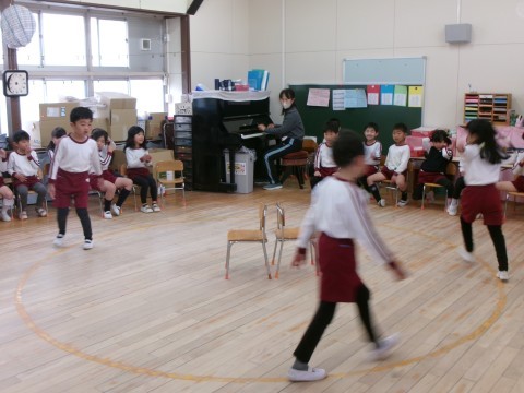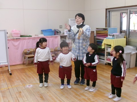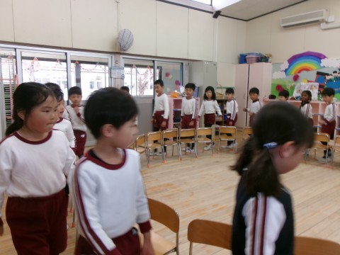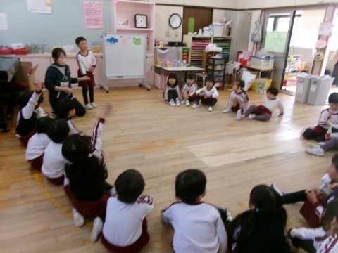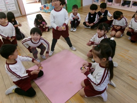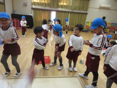 今年度最後の誕生日会のお楽しみは,5歳児の好き・得意な遊びを見たり教えてもらったりして遊ぶことを全園児でしました。