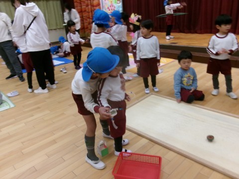 保育室では,お友達のいいところみつけをしたり,お休みだったお友達の誕生会やコマ大会をしたりしました。