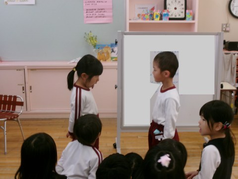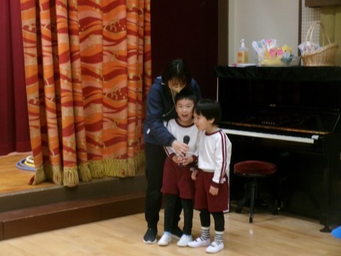 今日は,初めてうさぎ組さんだけでお誕生日会の司会をしました。昨日保育室で練習して,「がんばるぞー!」と気合満々で挑みました。いざ前に立つと,少し緊張する姿もありましたが,お友達と息を合わせて言うことができましたよ😊