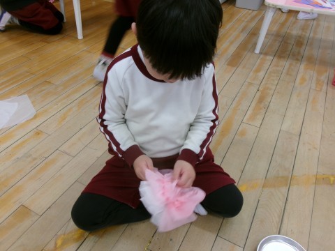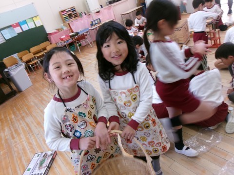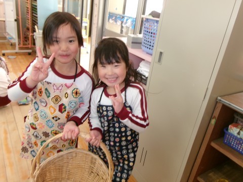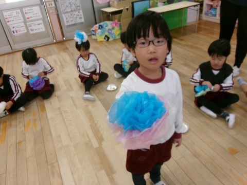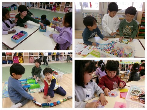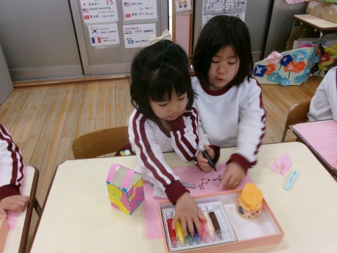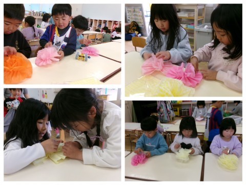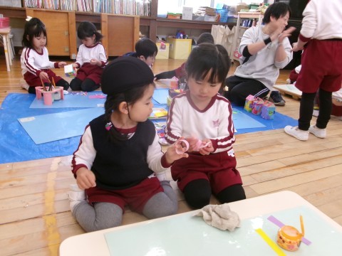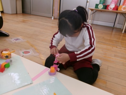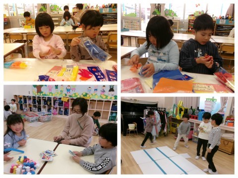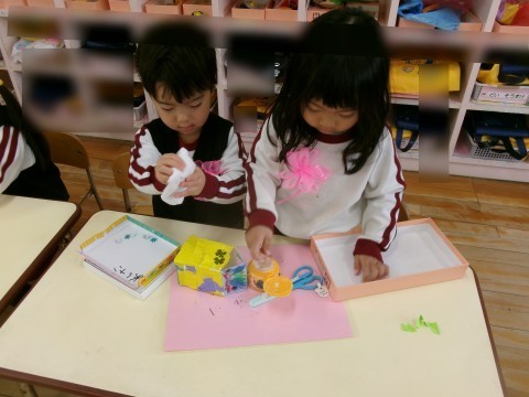 保育室では,そら組さんへのプレゼントづくりの続きをしました。今日も昨日と同じペアで相談しながらつくりました。「どうする?」とたんぽぽ組さんに優しく聞いてあげる姿や,難しいところは「難しいから私がするね!」とやってあげる姿があり,お姉さん・お兄さんな姿を見せてくれました☆