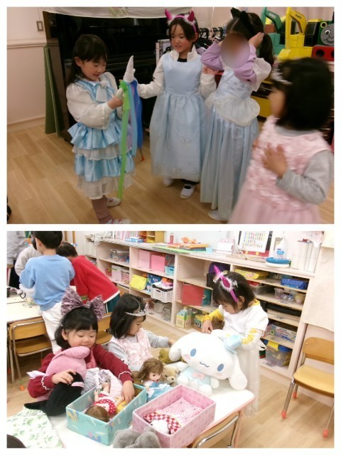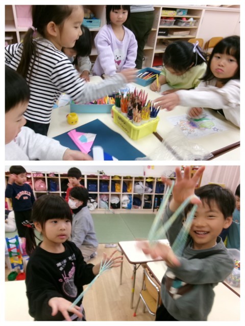 お部屋では年長さんが自然と小さいお友達に,あやとりやお花の作り方を教えてあげる姿が見られました。教えてもらった子どもたちは笑顔であふれていましたよ💓