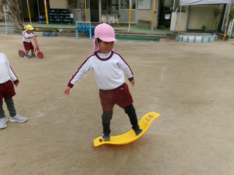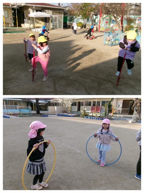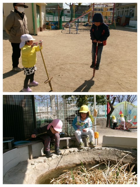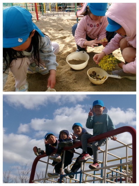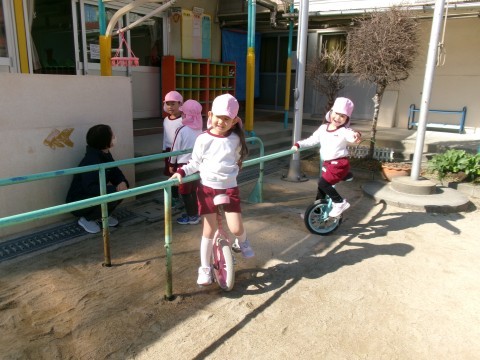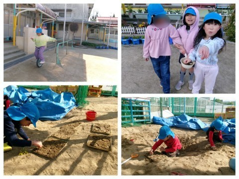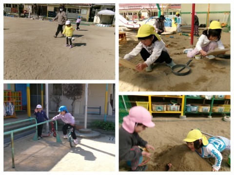 春の兆しを感じながら,子どもたちは一輪車や鬼ごっこトンネル掘りを楽しんでいました。