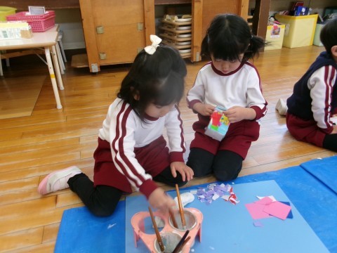 ボンドをつけて,ちぎった折り紙を牛乳パックに貼ったり,輪つなぎを丁寧にしたりしました