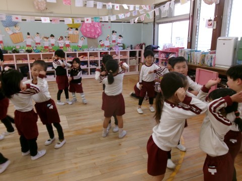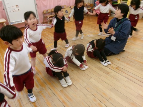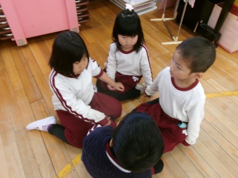 研究テーマ「人とかかわる力を育む」のもと,普段の遊びや生活,また毎月の誕生会でのふれあい遊びや預かり保育で一緒に過ごしてきた中で,少しずつ友達とかかわる経験を積んできた子どもたちです。