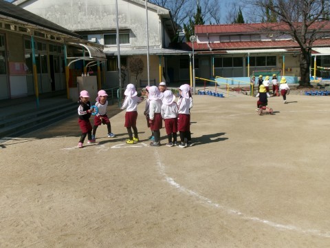 園庭でうさぎ組さんがリレーを始めた様子を見て,「一緒にやろう!」と声をかけた子どもたち。