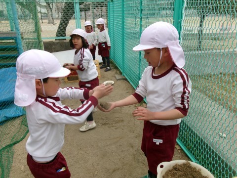 泥団子をつくる子どもたちの姿も。「ここの土がいいねん!」「サラ砂つけたら固くなるねん!」と子どもたち同士で教え合いながらつくることを楽しんでいました♪