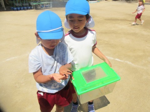 幼稚園の庭に新たな幼虫がやってきました。さてさて何の幼虫かな?