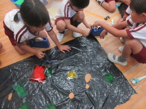 その後、保育室のプラネタリウムをつくることになりました。どうやって屋根をつくろうかな?としばらく考えていた子どもたちです。「画用紙やったら重いし・・・」「星が見えるみたいにするんやったら、うすいやつがええんちゃう?」など、それぞれが思いついたことを言葉にしていきます。「あの、透明みたいな黒いやつやったらいいやん」とビニル袋を屋根にすることになりました。ビニル袋を蛍光灯の光に透かしてみながら、「これは星みたいじゃないなあ」「穴あけてみたらどうやろう?」と、穴をあけていきます。