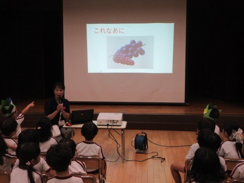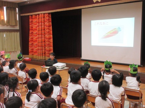 今日のお楽しみは,園長先生の「なんでしょう?」クイズでした。色や形,身近な果物や野菜のシルエットに,即答✨の子どもたちでした。さすがです!