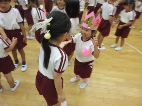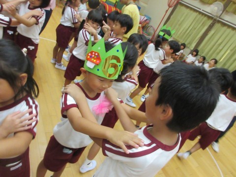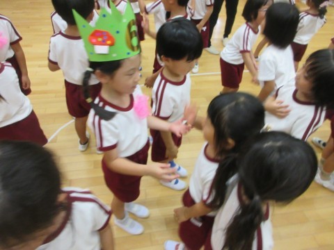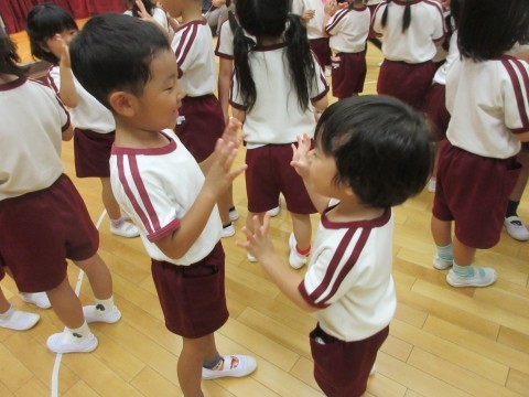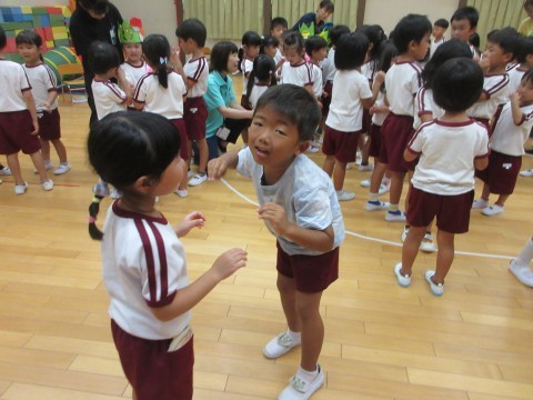 みんなで♪てくてく~歩いて♪と遊びました。クラスを超えて,いろいろな友達と触れ合うことが楽しくなってきた子どもたちです。歌に合わせてすぐさま友達を見つけたり,誰かのお誘いを待っていたり…手をつなぐとニッコリ笑顔です。みんなで楽しかったね。