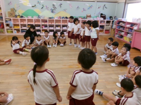 かごをよく見ること,膝を使って投げることを意識して投げることができたね!今日は笛の音をよく聞いて,始めたりやめたりすることをみんなで確認しました。
