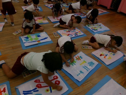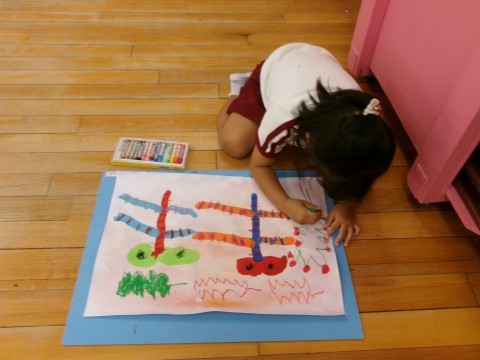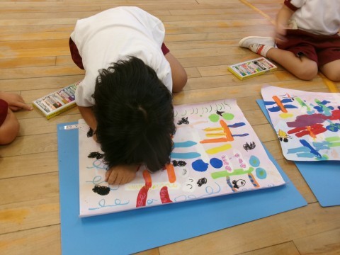 振り返りの際には,「トンボがかくれんぼしてる!」「もうすぐ夜になるから歌を歌ってるんだよ!」などと描いた絵についてみんなに教えてくれました。