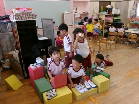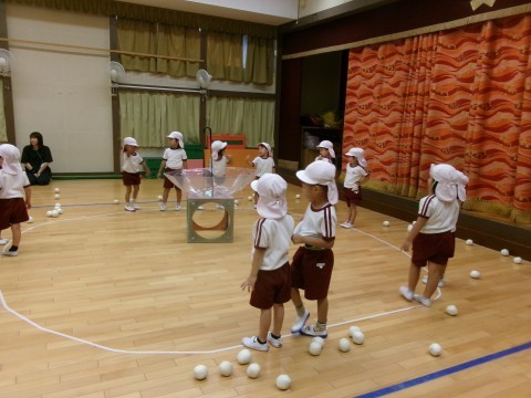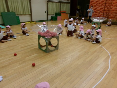 それぞれのチームが「えいえいおー!」と気合を入れてスタートしました!みんな玉を投げて入れるのが上手になってきています。