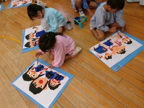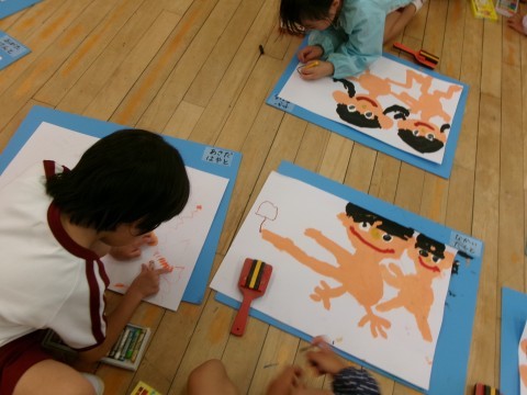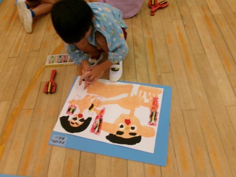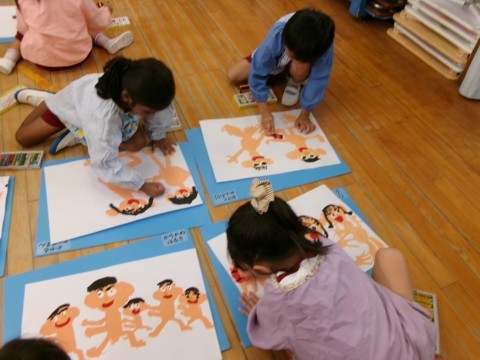 ソーランの絵の続きを描きました。鳴子を実際に絵の上に置いてみたり,鳴子をじっくりと見たりしながら描いていましたよ。「法被も着せないと!」「ハチマキも描こう!」と意欲的に描く姿が見られました。