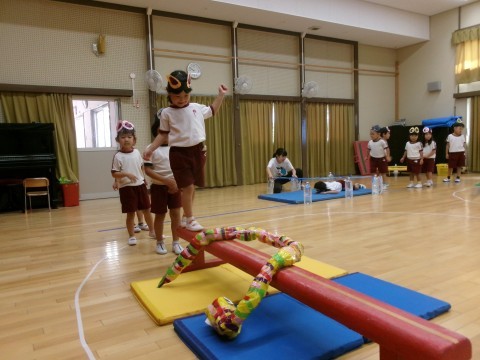 朝,みんなでつくったヘビさんがはらっぱの橋の上に!ヘビさんのしっぽには毒があって,刺されると大変!?ヘビさんを踏んで怒らせないようによけながら渡ることができました。