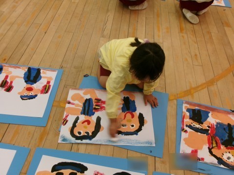 今日はコンテを使って,地面や空を描きましたよ。コンテを塗った後に,くるくるとティッシュをつかってこすってみると・・・・。塗ったところがほんわりぼやけてきます。「おもしろいね」と子どもたち。楽しんで取り組んでいましたよ。
