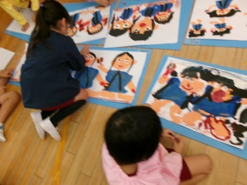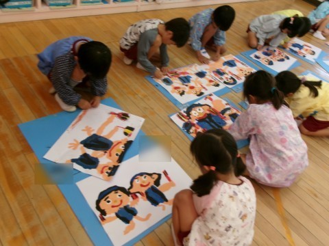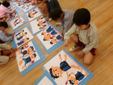 絵を描く前に,子どもたちは園庭で元気にソーラン節を踊り,たんぽぽ組のお友達に「かっこいい」とほめられ思わずにっこり。そのうれしい気持ちのまま絵を描き始めた子どもたちです。コンテの楽しさを感じたり,園庭に飾った万国旗を丁寧に描いたりしていました。運動会への意欲が絵からも伝わってくるすてきな一枚ができあがりましたよ。