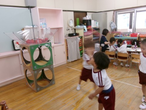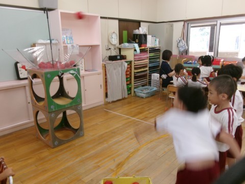 朝登園してきた子どもから玉入れをして楽しむ子どもたち。「入った!」「昨日より入れられるようになった!」などと入ったことを喜び,何度も投げることを楽しむ姿がありました。