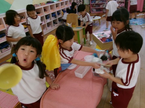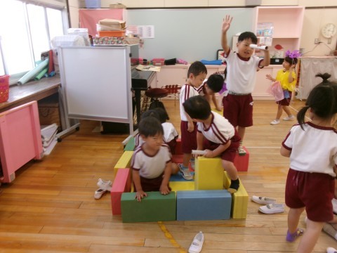自発活動では,ソフトブロックを使って船をつくる子どもたちの姿がありました。できた船にみんなで乗ってみたり,つくった望遠鏡で遠くをのぞいたりする姿がありました。お店屋さんごっこで売っているお弁当を買ってきて,船の中で食べることを喜ぶ姿もありましたよ♪