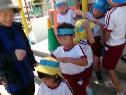 「一緒にする?」と声をかけて,ハチマキをしめてくれるお兄ちゃんたちのやさしさに,小さいお友達も思わずにっこり。