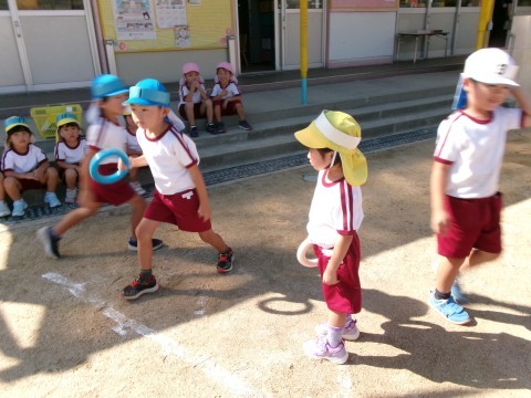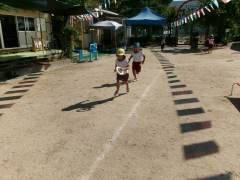 「小さい組さんと走る時は,本気で走ったらアカンで」と走る速度を調整したり,途中で止まってしまったお友達の手を引いて一緒に走ったりしていましたよ。小さいお友達のことを考えて接する姿に年長組の成長が感じられます。