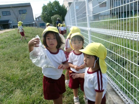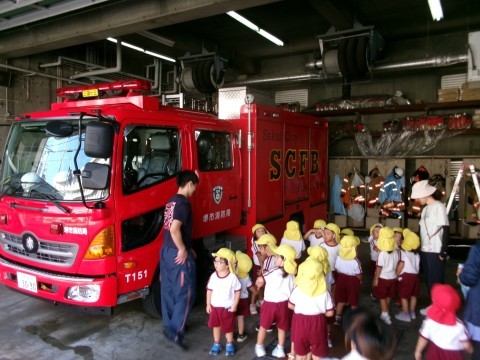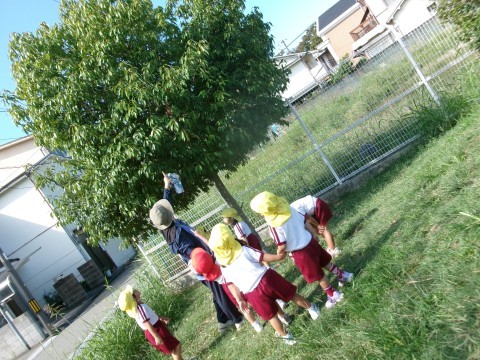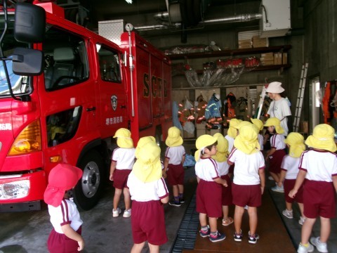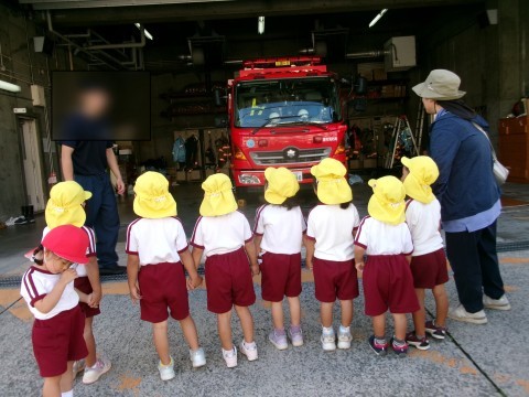 幼稚園から,消防署まで行き,消防車を見せてもらったり,公園でどんぐりの赤ちゃんやバッタを見たり捕まえたりしました