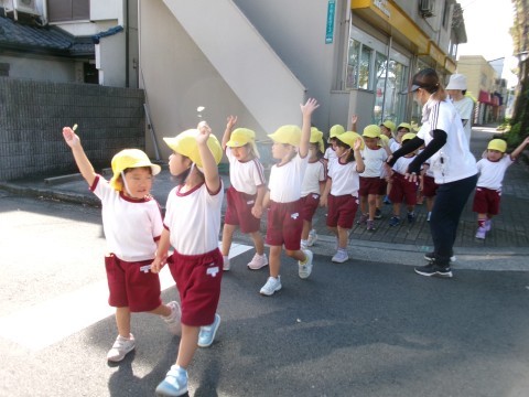 子ども達は,歩くことが少しずつ上手になり,前の人が進んだらつめたり,道路を渡るときは手をあげたりしていました