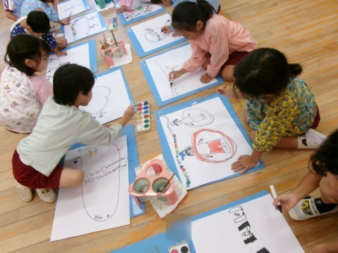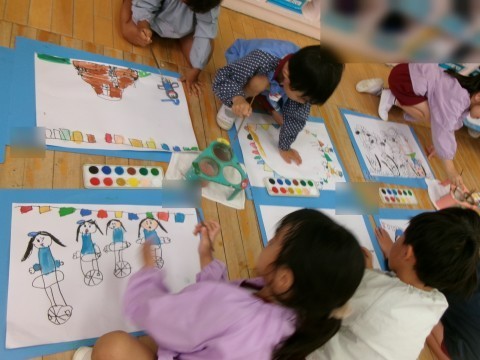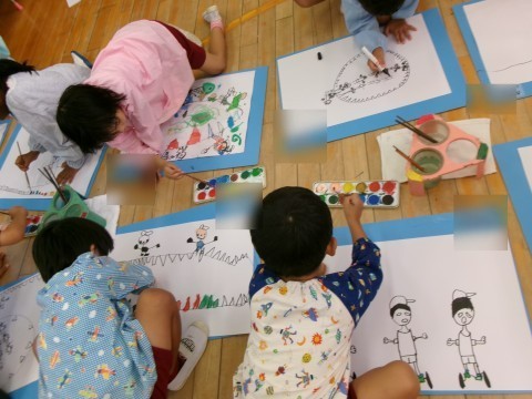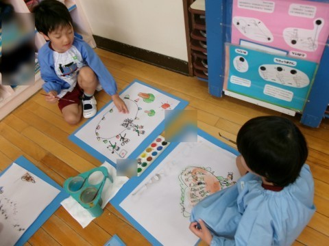 どこにどの色を塗ろうかな?と考えたり,「もっと描いてみる」とペンをとって描き加えたりと,楽しみながら描く姿が見られました。絵の具だけでなく,コンテや墨汁などにも触れる機会もつくり,絵を描く楽しさを感じてほしいと願っています。